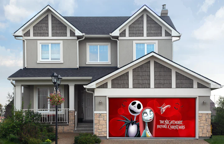 Introducing The Nightmare Before Christmas Garage Door Cover – a spooktacular way to transform your garage into a hauntingly enchanting scene!